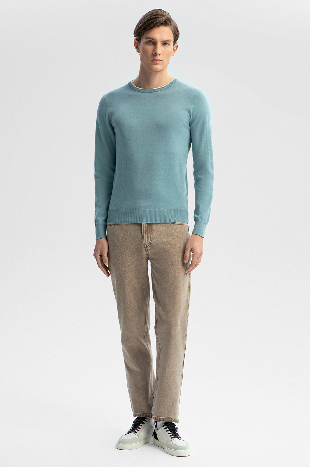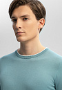 Джемпер KANZLER в мятном оттенке – универсальный выбор для рабочего дня в офисе, прогулок, встреч и неформальных мероприятий. Натуральный смесовый материал объединил мягкость премиального хлопка (80%) и прочность благородного льна (20%). Дышащая ткань обеспечивает нежное соприкосновение с телом, не раздражая даже чувствительную кожу, регулирует комфортную температуру и сохраняет форму после многократных стирок. Полуприлегающий силуэт с мягкой резинкой на манжетах и по низу изделия гарантирует аккуратную посадку по фигуре. Белая окантовка на круглом вороте – акцент, добавляющий облику свежести. Сочетайте модель с классическими брюками, брюками или денимом. Параметры модели: рост 191, 97-77-99 Размер на модели: M