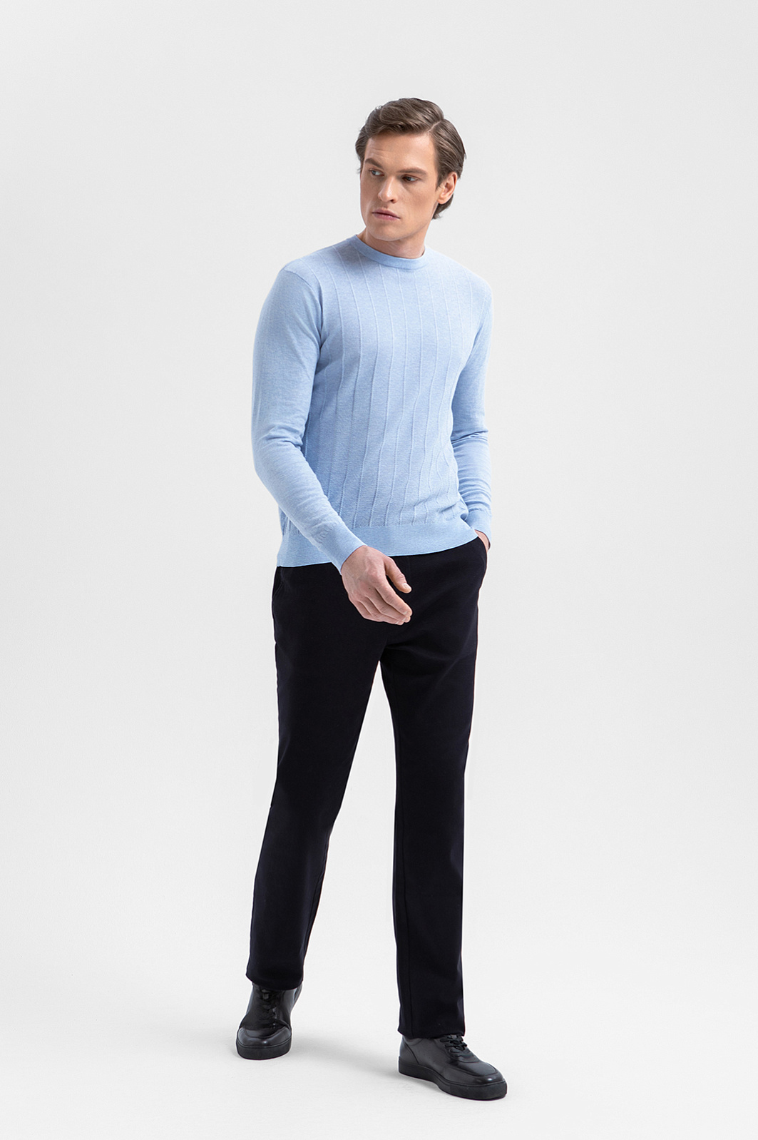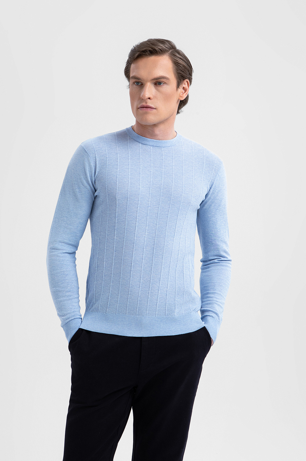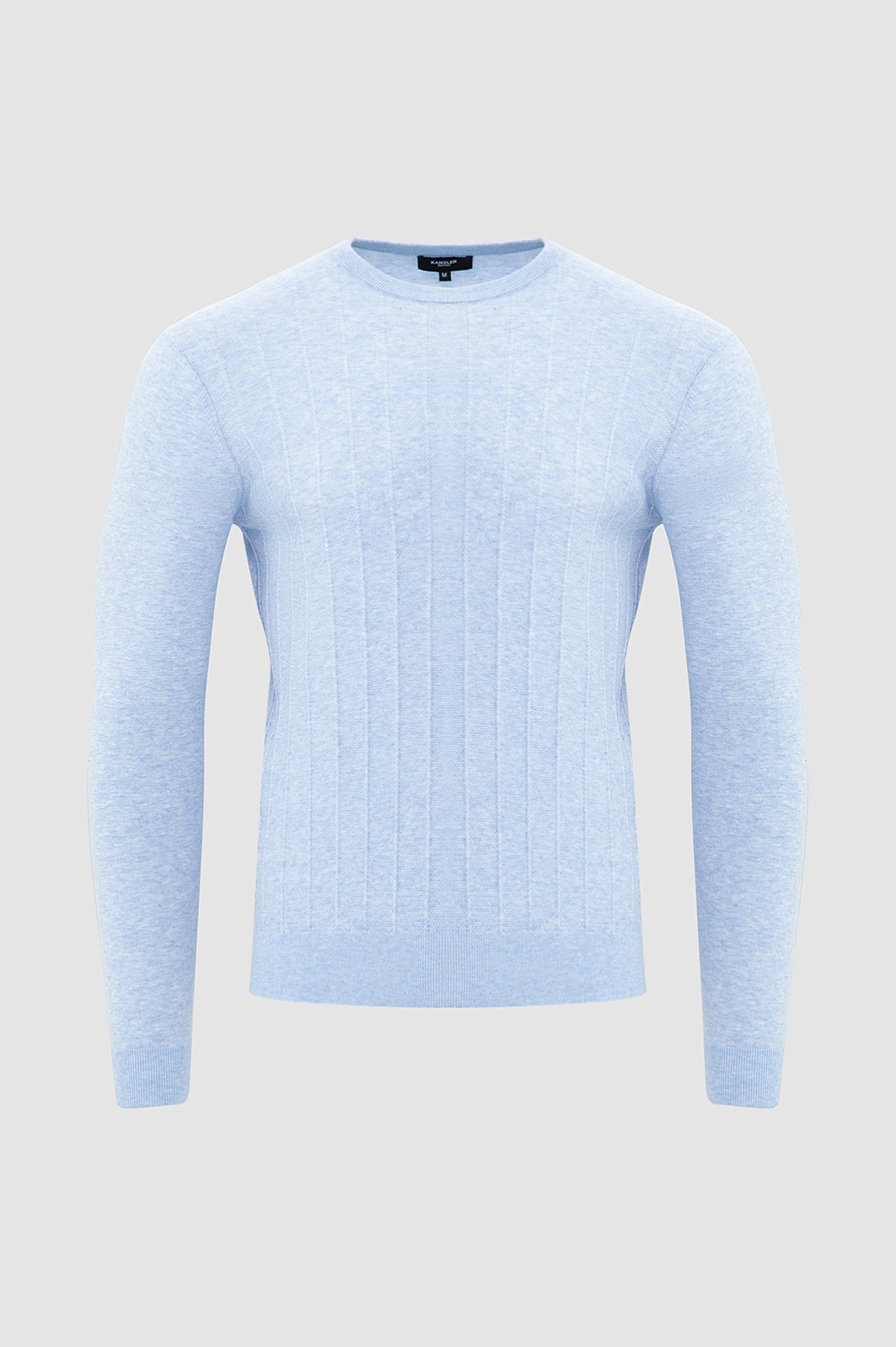 Джемпер KANZLER из 100% хлопка Пима — воплощение тихой роскоши, которая умеет привлекать и удерживать внимание без показной демонстративности. Вертикальные фактурные полоски придают джемперу архитектурную строгость и визуальную глубину, а светло-васильковый оттенок добавляет образу свежесть и лёгкость. Дорогой трикотаж создан из хлопка Пима — материала, который ценится за мягкость, шелковистую текстуру и долговечность. Его волокна значительно длиннее и тоньше, чем у обычного хлопка, благодаря чему ткань приобретает особую мягкость, исключительную прочность и способность сохранять безупречный внешний вид сезон за сезоном.