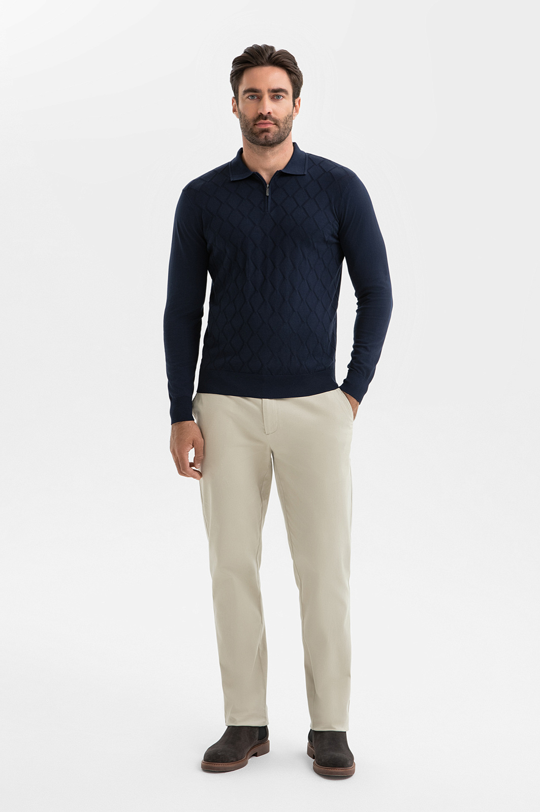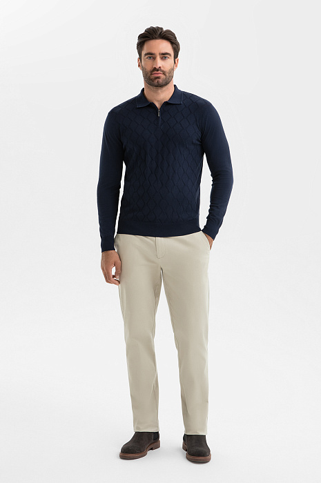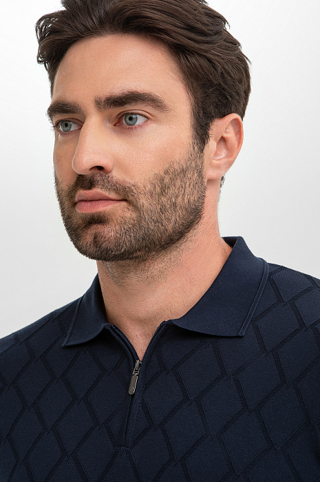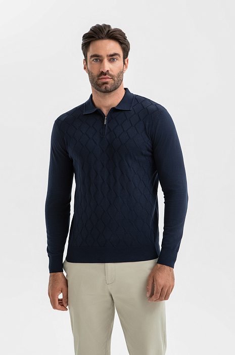Джемпер поло KANZLER – неизменная классика мужского гардероба. Для создания модели выбрали 100-процентный премиальный хлопок, мягкий гипоаллергенный материал, который обеспечивает идеальный воздухообмен и подходит даже чувствительной коже. Деликатный фактурный узор в ромб добавляет образу выразительность и подчеркивает глубину темно-синего оттенка. Поло – стилеобразующий элемент, который легко сочетается как с брюками в стиле кежуал так и с более формальными моделями. Параметры модели: рост 192, 108-83-102 Размер на модели: M