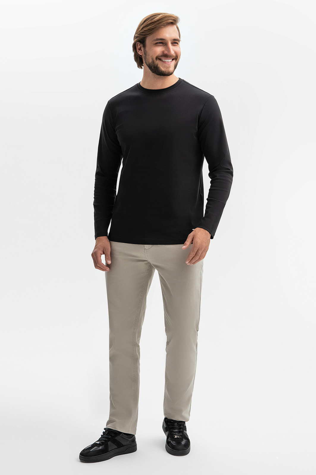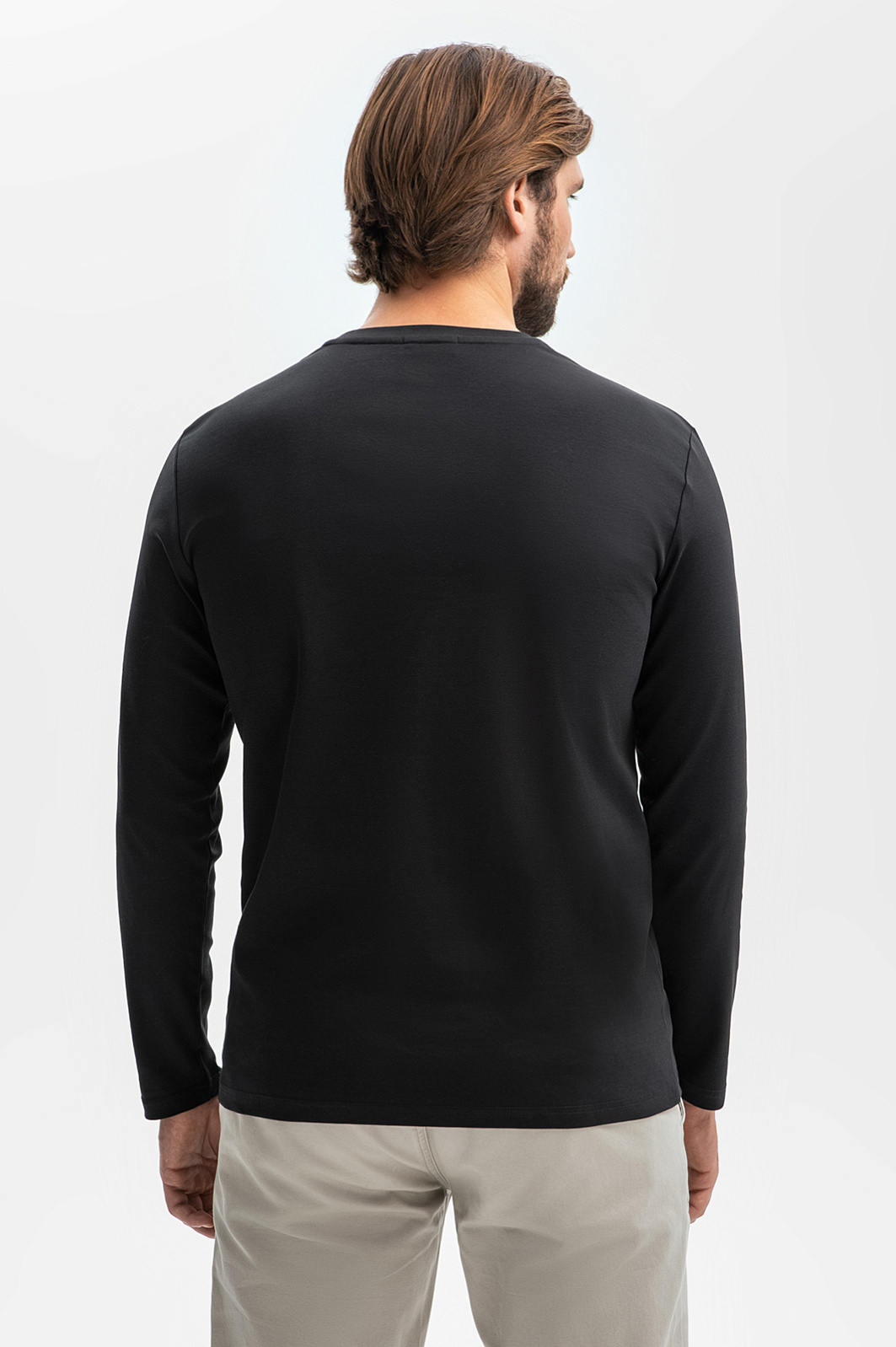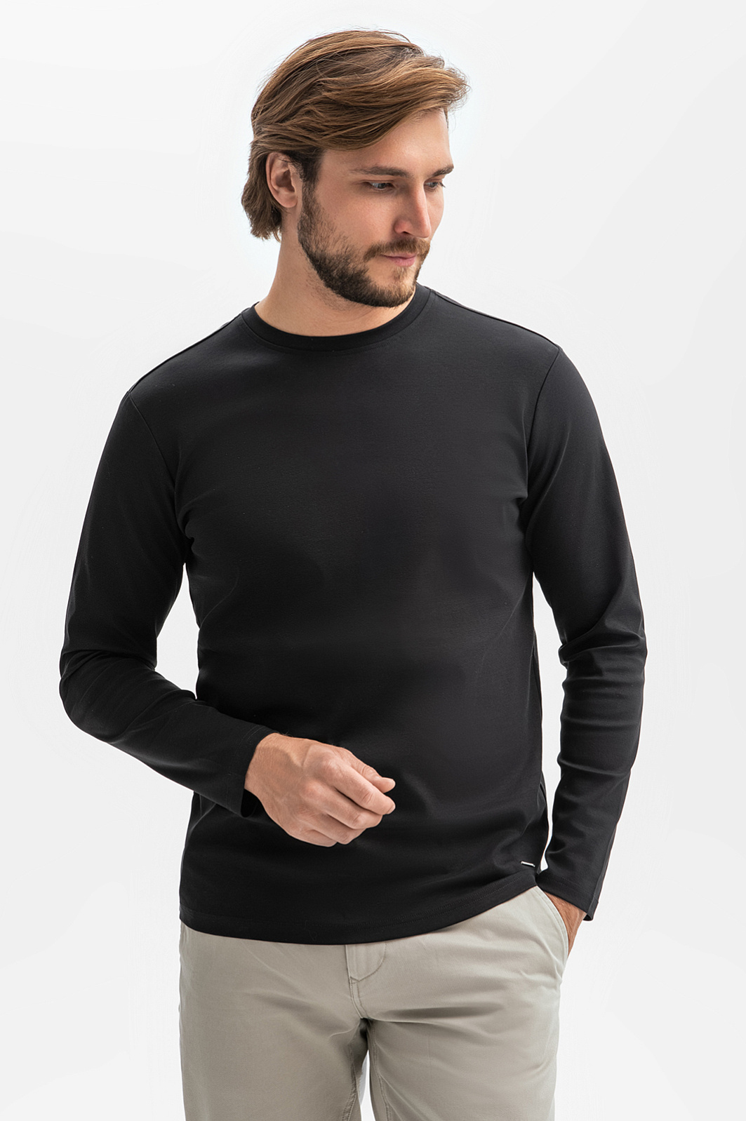 Черный лонгслив из 100% хлопка — воплощение минимализма и утонченного стиля. Этот базовый элемент гардероба сочетает в себе мягкость натурального материала и безупречный крой —идеальный вариант для повседневного образа. Хлопок премиального качества дарит телу комфорт и позволяет коже дышать, что особенно важно для активных людей. Глубокий черный цвет не выгорает и не линяет даже после многократных стирок, а плотность ткани обеспечивает стойкость к износу. Лаконичный силуэт позволяет легко сочетать модель с джинсами и брюками разнообразных фасонов. Элегантная простота делает лонгслив идеальным выбором как для офиса, так и для повседневной жизни. Модель украсили металлическим шильдиком с логотипом бренда. Параметры модели: рост 187, 100-81-97 Размер на модели: M