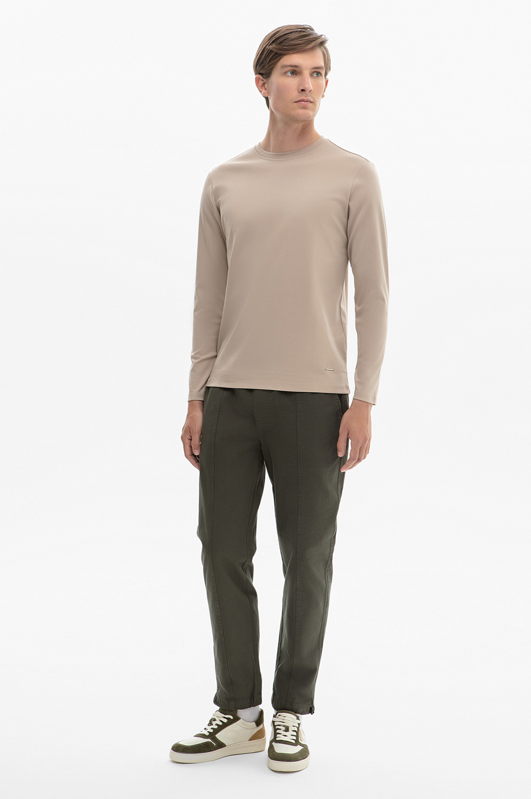 Базовый бежевый мужской лонгслив из 100% хлопка — безупречный комфорт в каждой детали. Высококачественный хлопок обеспечивает нежное соприкосновение с кожей, позволяя телу дышать и оставаясь мягким после множества стирок. Бежевый оттенок добавляет нотку элегантности и легко комбинируется с одеждой различных стилей. Лонгслив подходит для самых разных мероприятий: от офисного дресс-кода до расслабленного уик-энда. Идеально выверенный крой и аккуратные швы подчёркивают внимание к деталям. Универсальность модели позволяет носить ее круглый год, в том числе в качестве базового слоя в сочетании с кардиганами и пиджаками. Этот стильный, удобный и долговечный элемент станет основой гардероба, добавляя нотку сдержанной роскоши в каждый образ. Параметры модели: рост 191, 97-77-99 Размер на модели: M