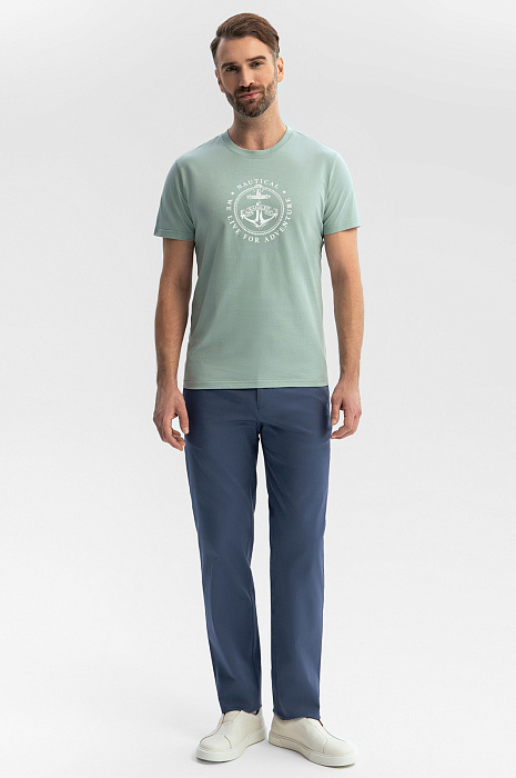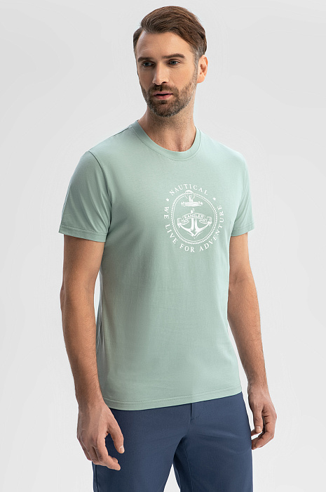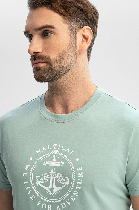 Футболку KANZLER приятного мятного оттенка из чистого хлопка с морским принтом на груди стоит захватить с собой на отдых, в путешествие. Она хорошо сочетается с легким золотистым загаром и отпускным настроением. Традиционный крой с прилегающим силуэтом подчеркивает достоинства фигуры. Ткань из 100-процентного хлопка — настоящий праздник для тела. Она хорошо тянется, не сковывая движений. Мягкие воздушные волокна не раздражают даже самую чувствительную кожу, обеспечивают телу комфортную температуру и защищают от жары.