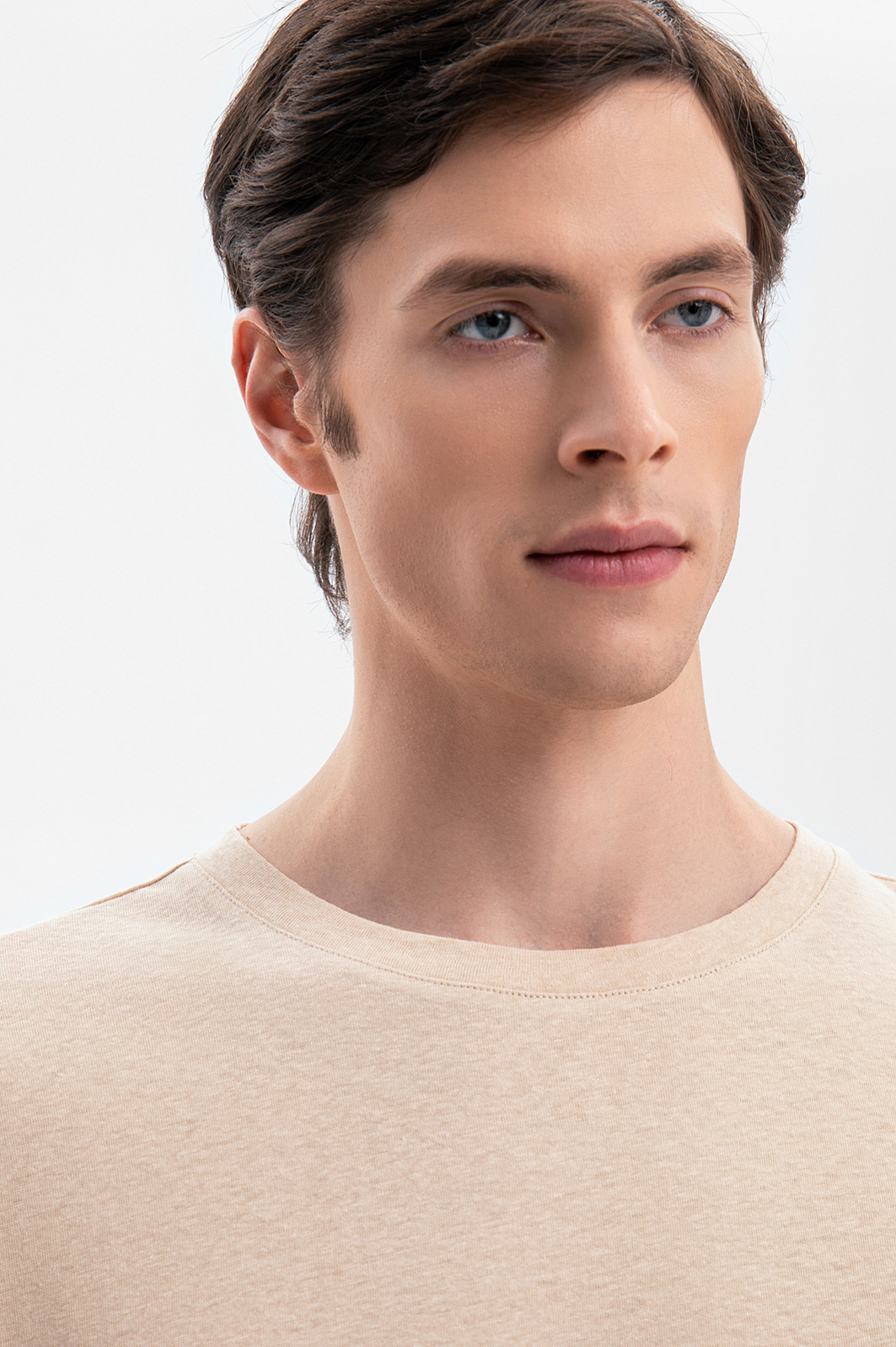 Футболка – ключевой элемент весенне-летнего гардероба. В новой коллекции дизайнеры KANZLER уделили особое внимание моделям, в которых для комфорта в теплое время года предусмотрено все. Бежевая футболка выполнена из натурального льна (55%) и хлопка (45%). Легкий смесовый материал отлично впитывает влагу, быстро сохнет и обеспечивает терморегуляцию, охлаждая кожу в жаркий день. Даже после многократных стирок футболка сохраняет форму и благородную матовую фактуру, характерную для премиального льна. Свободный крой не стесняет движений и подходит любому типу фигуры. Бежевый оттенок, благородный и универсальный, легко интегрируется в любой гардероб. Сочетайте футболку с льняными брюками и эспадрильями для городской прогулки, комбинируйте с рубашкой оверсайз и кроссовками в стиле городской кежуал или брюками и лоферами – для вечернего выхода. Параметры модели: рост 189, 91-78-95 Размер на модели: М