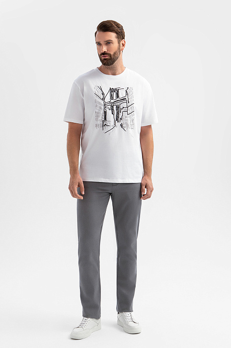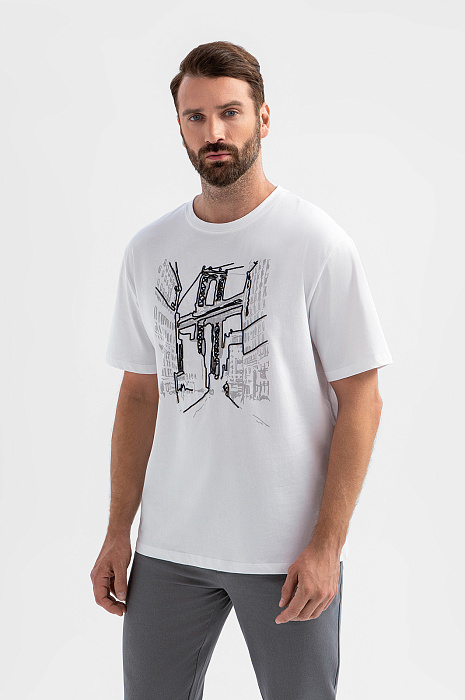Белая футболка KANZLER создана для ценителей урбанистической эстетики. Черно-серый принт на груди изображает мегаполис с его динамичным ритмом. Модель выполнена из 100-процентного хлопка, мягкого и гипоаллергенного материала, который обеспечивает идеальный воздухообмен, отводит влагу и сохраняет форму после многократных стирок. Свободный крой дарит максимальную свободу движений. Сочетайте модель с карго, брюками или денимом. Параметры модели: рост 189, 102-80-99 Размер на модели: M