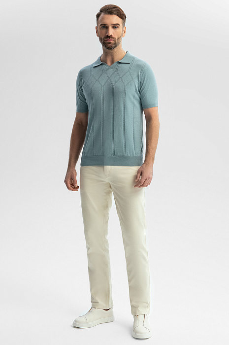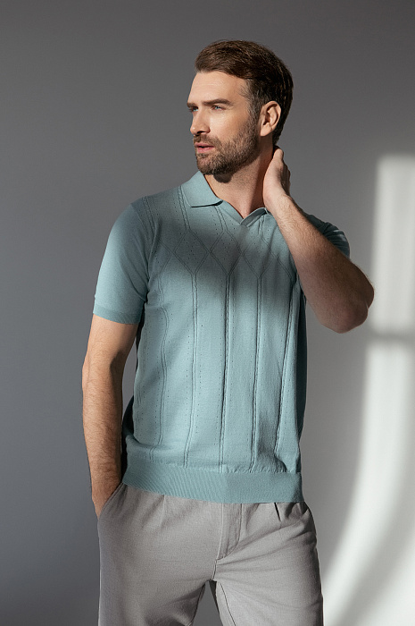 Поло KANZLER в освежающем мятном оттенке – идеальный баланс изысканности и комфорта. Для создания модели выбрали натуральный материал, объединивший лучшие свойства хлопка и льна. Мягкие гипоаллергенные волокна хлопка дарят ощущение нежности и обеспечивают воздухопроницаемость, а прочный лен сохраняет комфортный теплообмен – в поло не жарко в знойный день и тепло – в прохладный. Мятный оттенок добавляет образу легкости и глубины, а полуприлегающий крой создает изысканный образ, не сковывая движений. Ажурный узор превращает базовую модель в произведение искусства. Вертикально направленные полосы создают эффект стройности и визуально вытягивают силуэт. Дополните образ светлыми брюками и лоферами или сочетайте с бермудами и эспадрильями. Параметры модели: рост 189, 102-80-99 Размер на модели: M