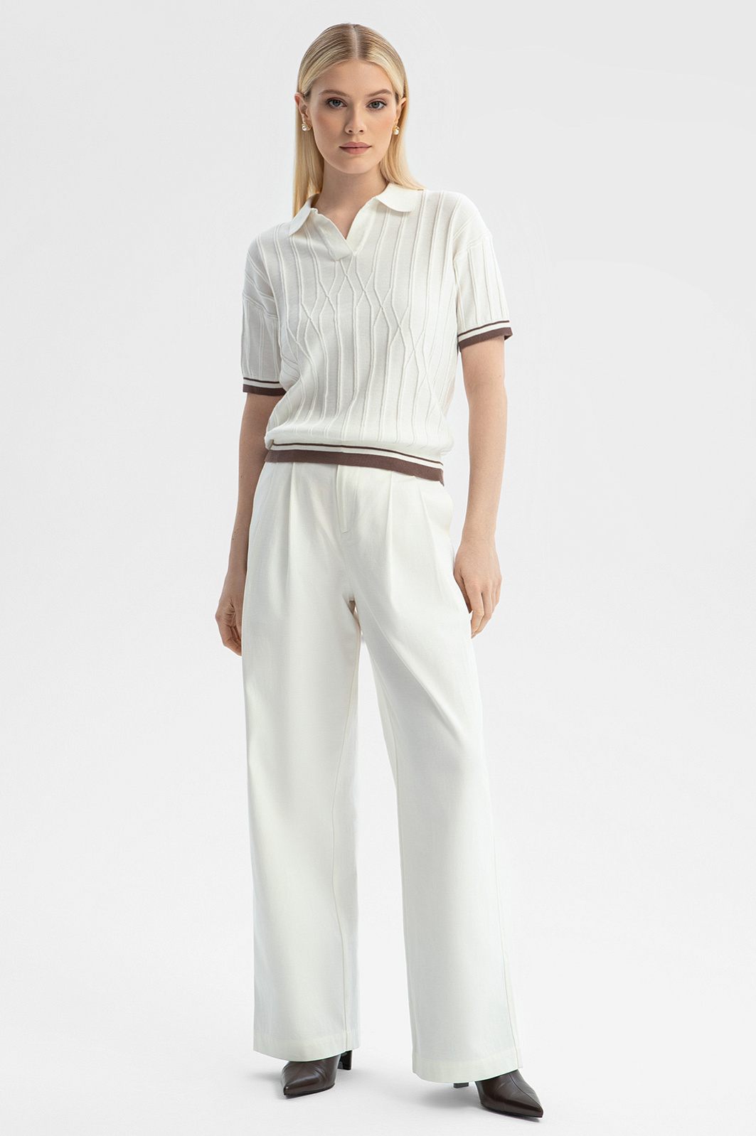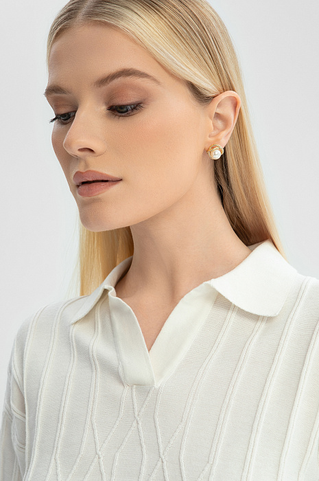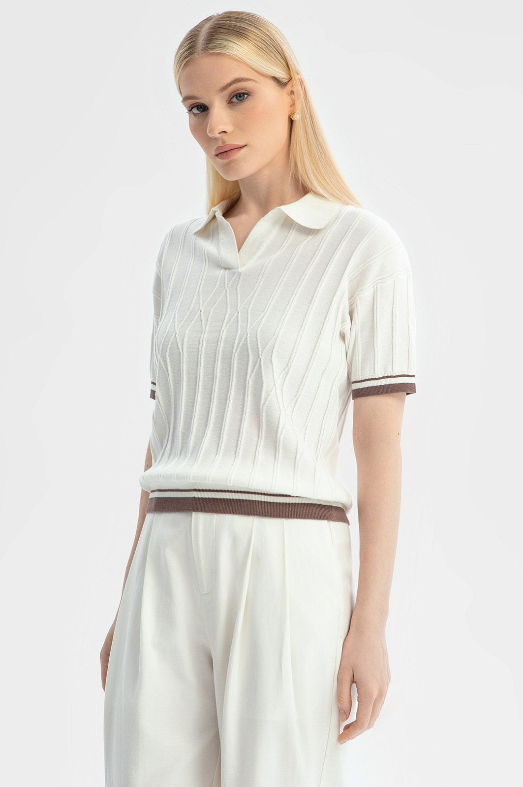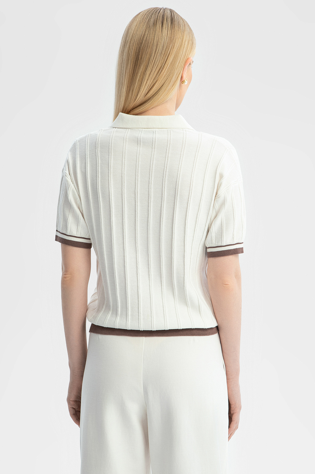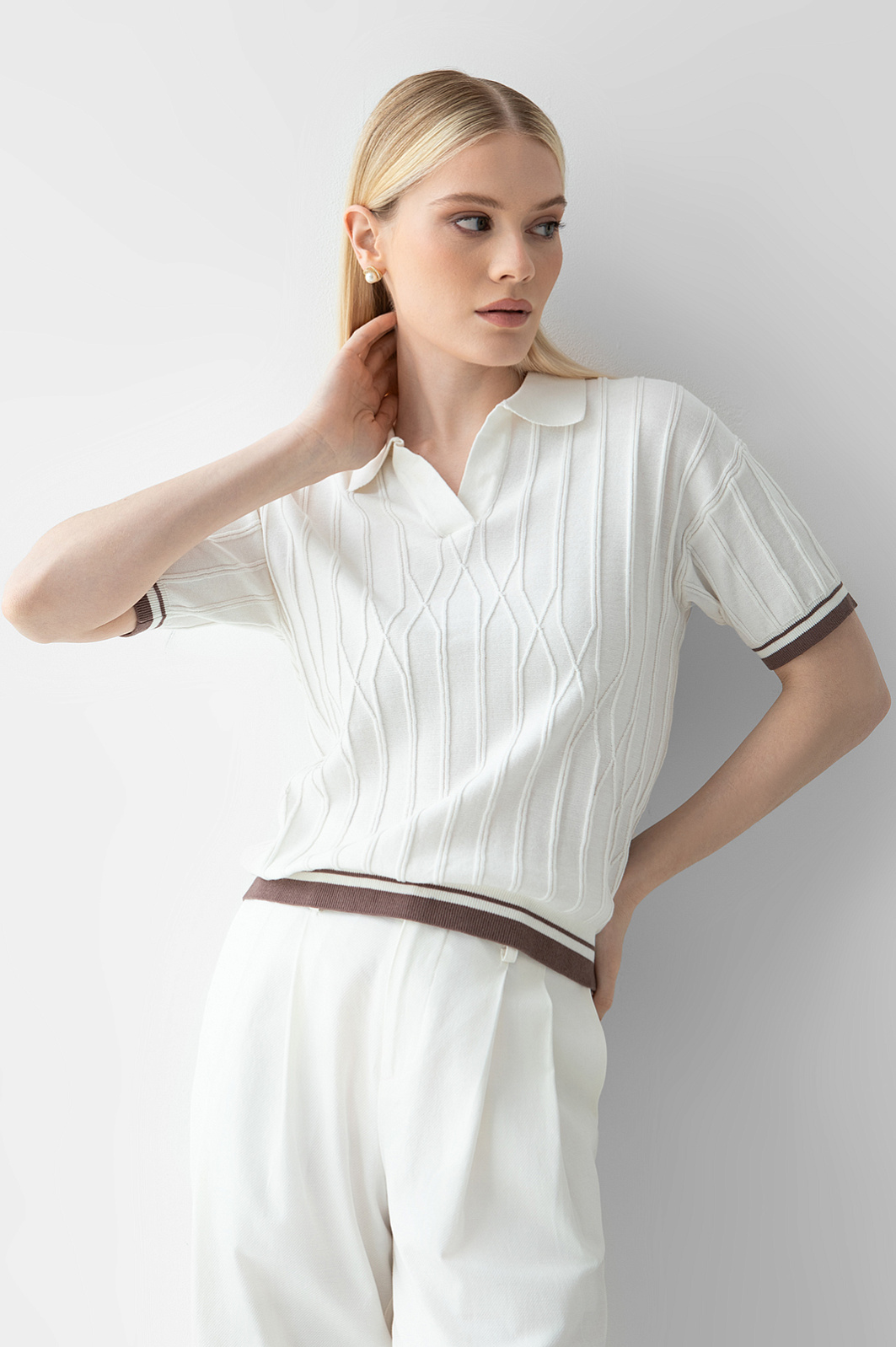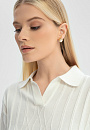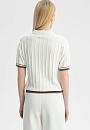 Поло KANZLER молочного оттенка из чистого хлопка — элегантная, неподвластная времени классика. Неглубокий Треугольный вырез обрамляет планка без пуговиц. Трикотажная резинка защищает края от растягивания. Фактурный узор придает модели нотку шика, двойная коричневая полоска снизу и на манжетах ненавязчиво подчеркивает спортивный характер. Поло выполнено мягкой легкой гипоаллергенной пряжи. Хлопок — настоящее спасение для тела в теплые и жаркие дни. Его структура обеспечивает циркуляцию воздуха и комфортную температуру. Параметры модели: рост 175, 88-65-92 Размер на модели: S