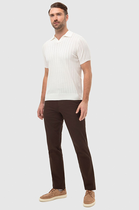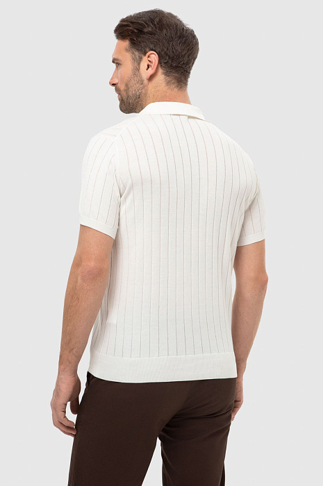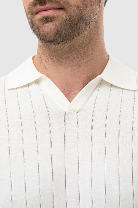 Поло KANZLER молочного оттенка с небольшим треугольным вырезом адресовано любителям спокойных уик-эндов, приятного отдыха и путешествий. Модель гармонично сочетается с одеждой естественных оттенков в стиле кежуал и спорт. Крой — прямой. Тонкие вертикальные перфорированные линии визуально вытягивают фигуру и придают образу легкость. Мягкий трикотаж безупречного качества из премиального 100-процентного хлопка Пима выглядит роскошно. Натуральные волокна пропускают воздух и отводят лишнюю влагу, поддерживая ощущение комфорта целый день. Параметры модели: рост 189, 102-80-99 Размер на модели: M