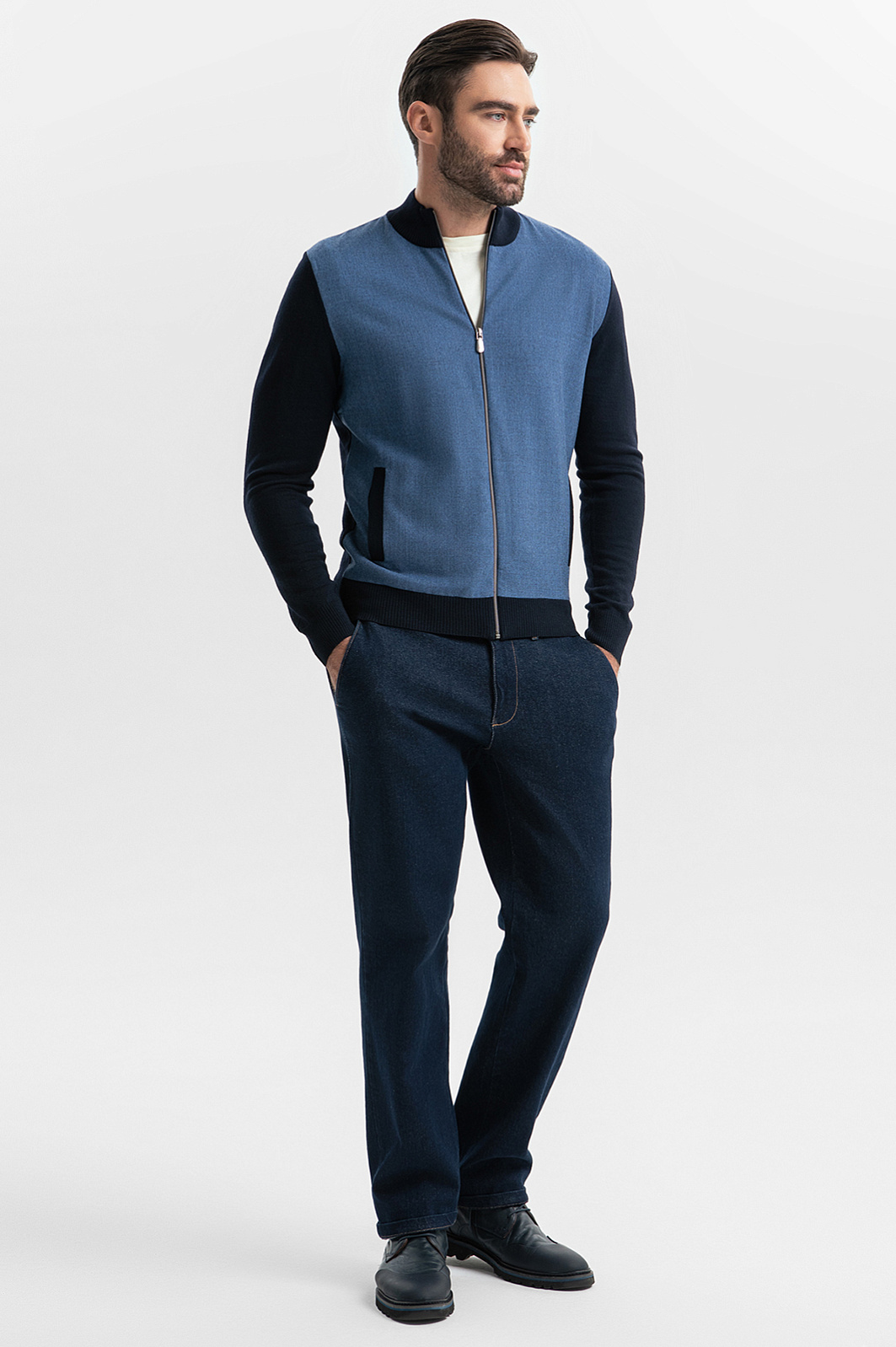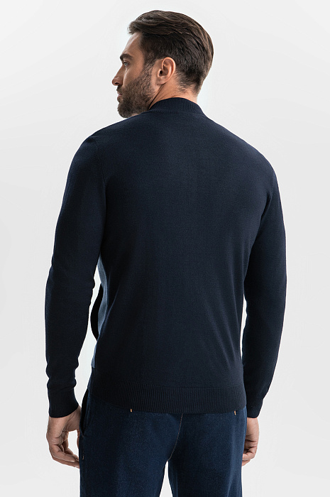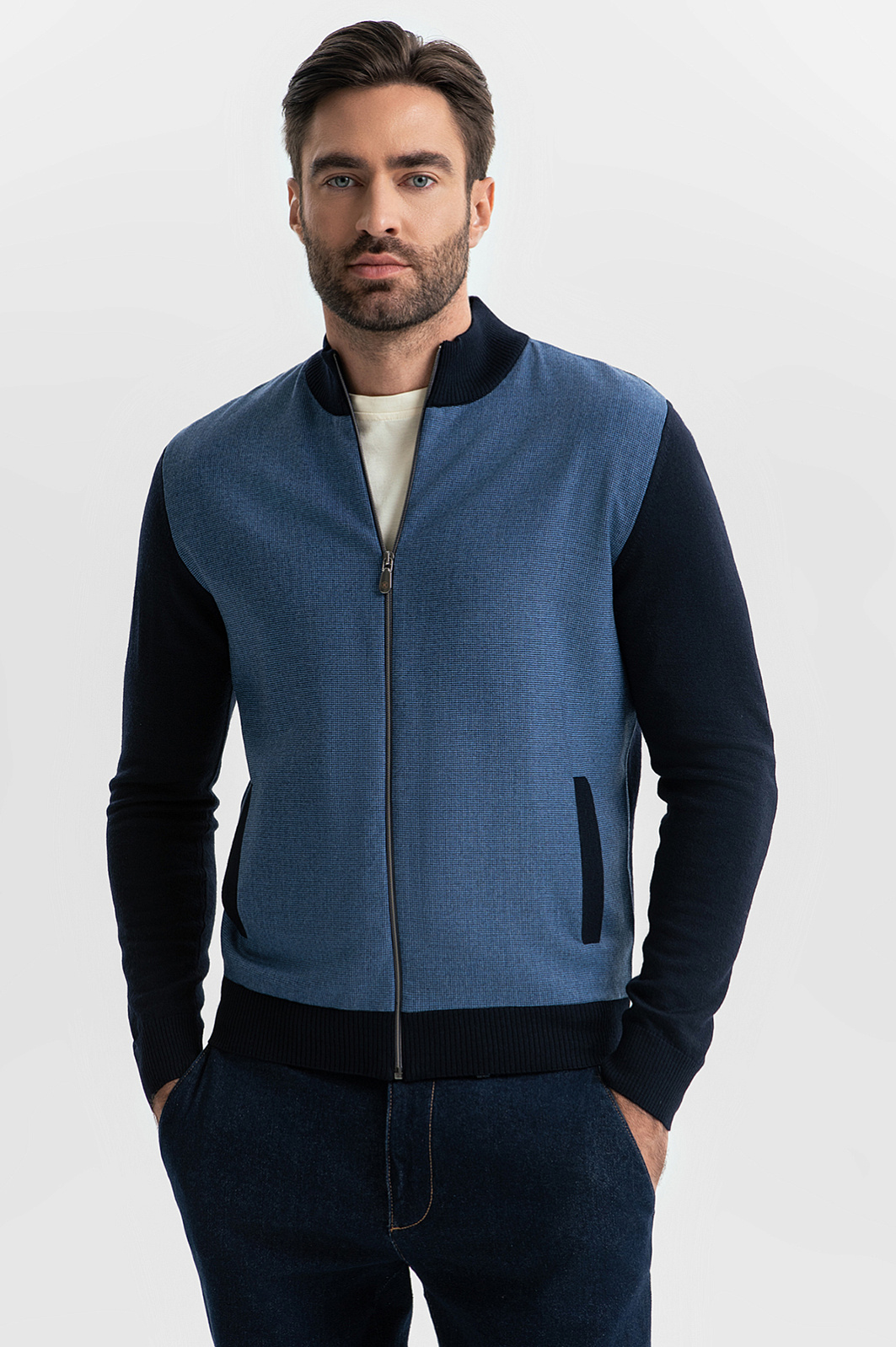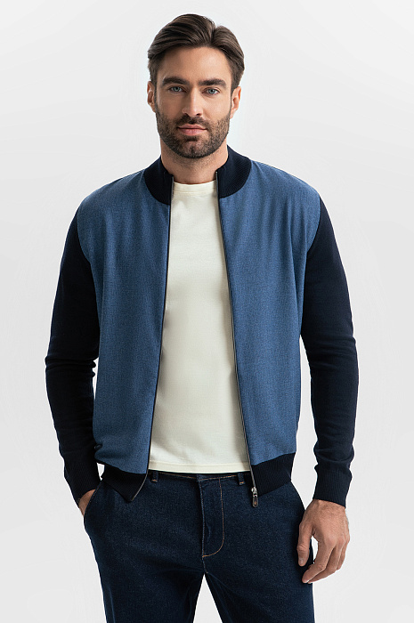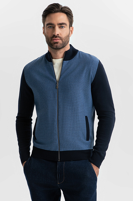 Кардиган на молнии из премиальной коллекции KANZLER — это идеальное решение для стильного многослойного образа. Его уникальный дизайн с отсылкой к трендовому фасону бомбера привлекает внимание сочетанием глубокого синего оттенка и насыщенного синего. Кардиган с круглым воротом выполнен из плотной, натуральной шерсти с приятной фактурой, которая обеспечивает тепло и комфорт. Модель с длинными рукавами и функциональными карманами с контрастной отделкой выглядит эффектно и практично. Рекомендуем сочетать изделие с однотонными брюками или джинсами и лаконичной футболкой для создания продуманного ансамбля. Такая комбинация подчеркнет оригинальный дизайн изделия. Параметры модели: рост 192, 108-83-102 Размер на модели: 50