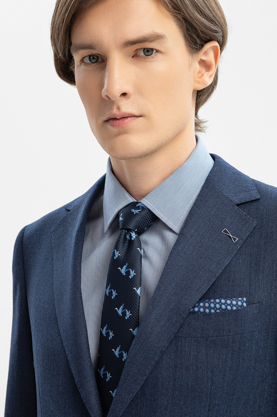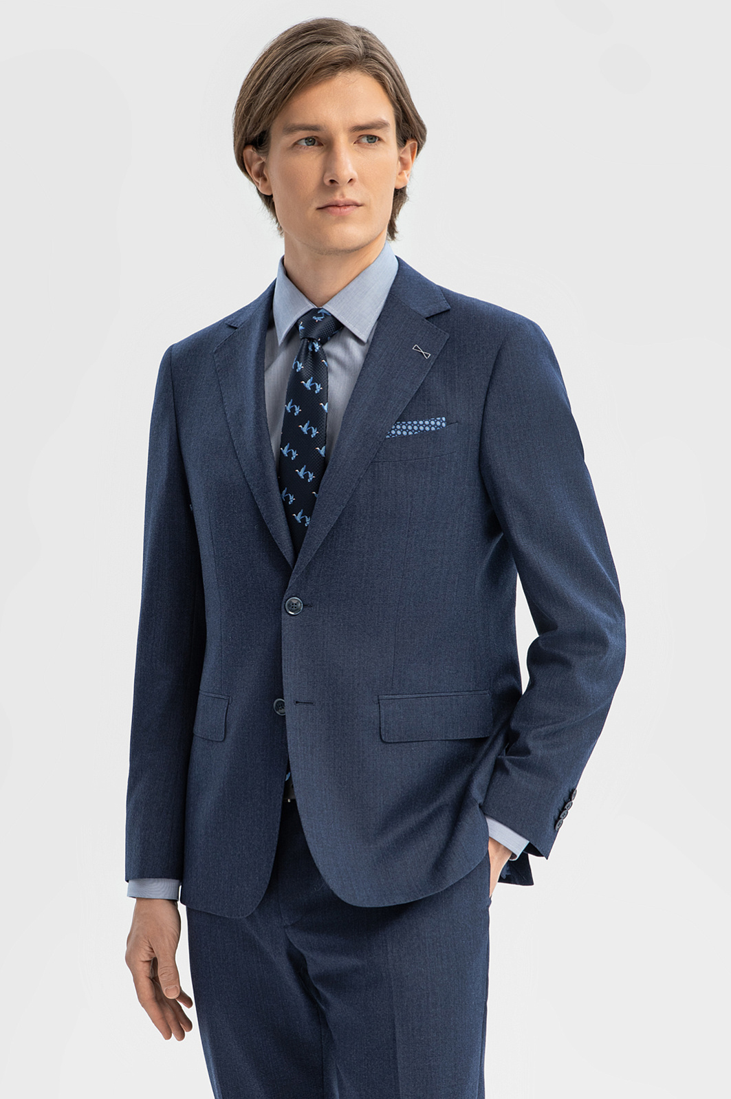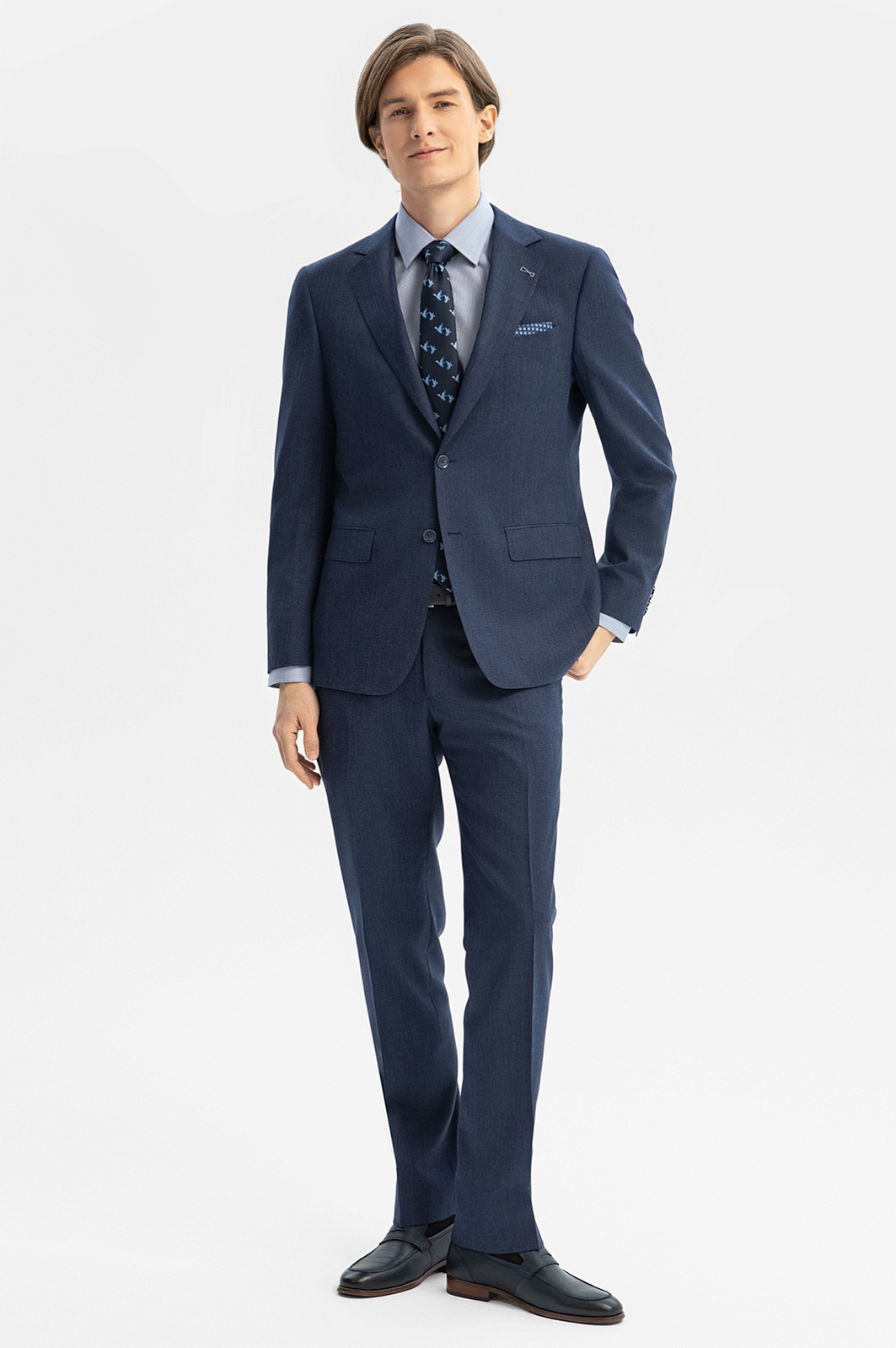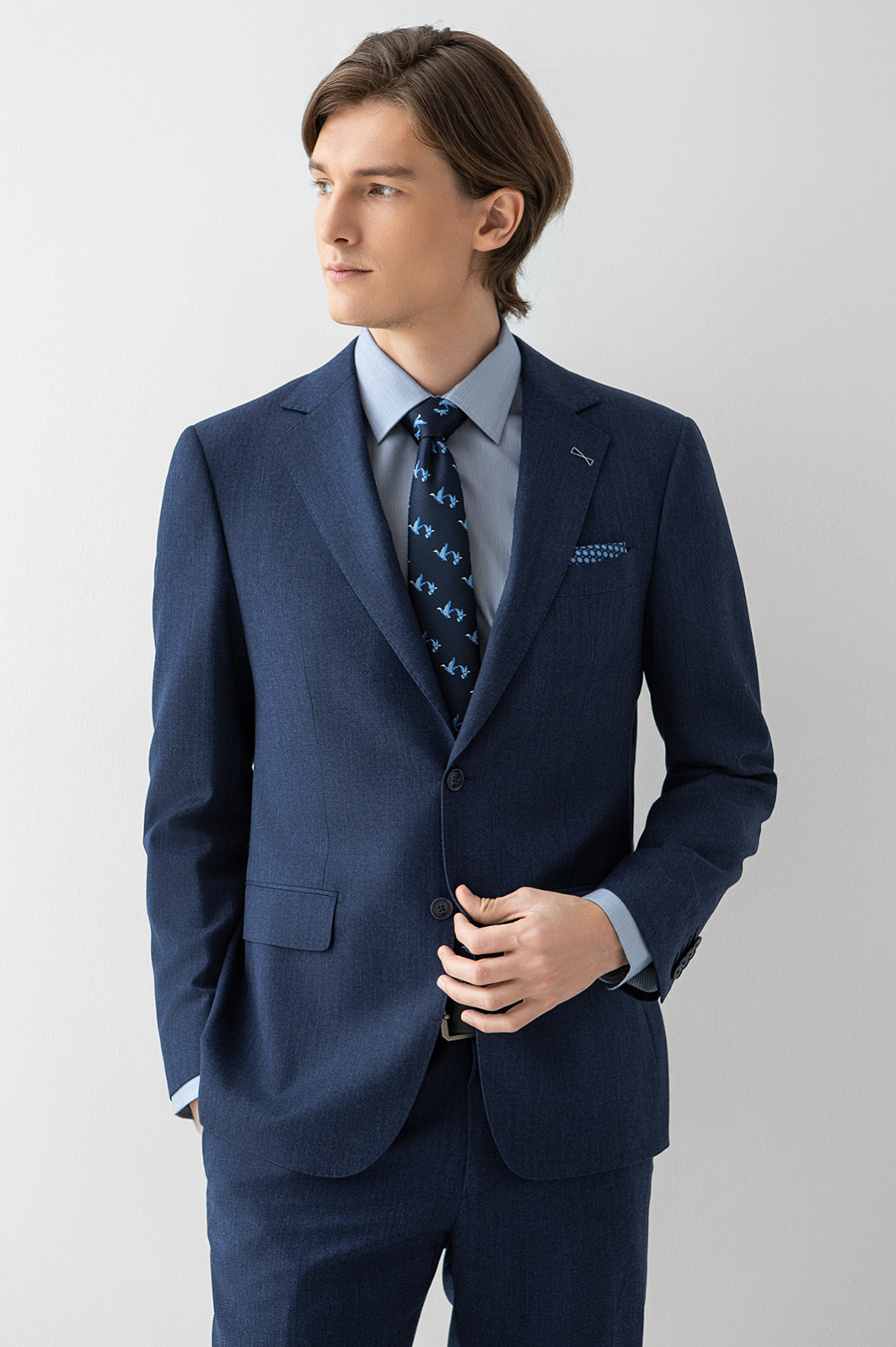Элегантный костюм KANZLER приглушенного синего цвета — прекрасный вариант для успешной деловой карьеры. Он сшит из тонкой премиальной шерсти мериноса, устойчивой к сминанию, и поэтому никогда не теряет форму. Небольшая вышивка на лацкане пиджака служит изысканным штрихом. Костюм составлен из классического пиджака с нагрудным карманом с листочкой, нижними карманами с клапанами и брюк чистого силуэта, без защипов, со стрелками. Долговечная костюмная ткань — чистая шерсть Супер 120S. Благодаря плотному скручиванию пряжи и упругости натуральных волокон, она превосходно держит форму и не мнется.