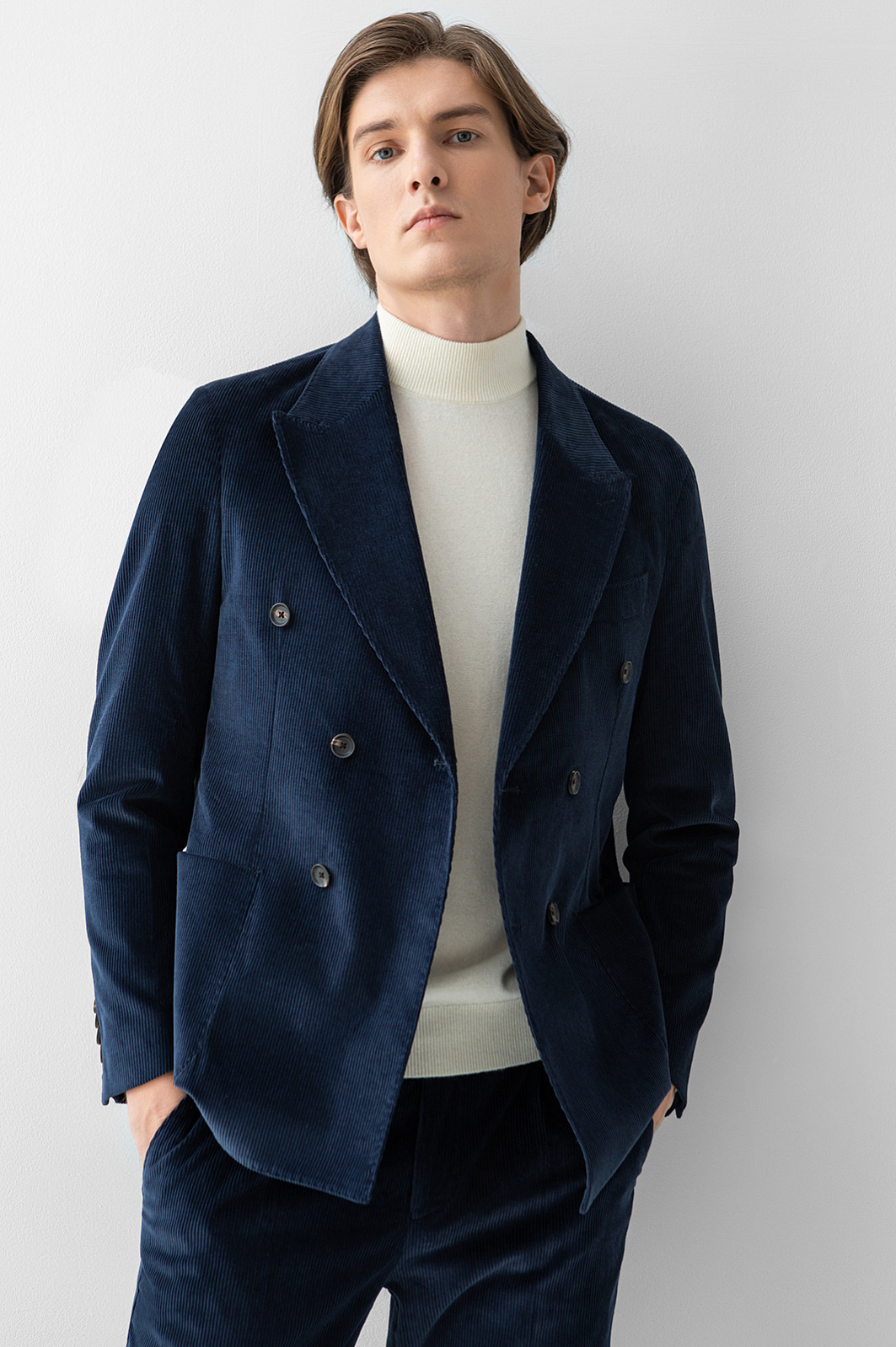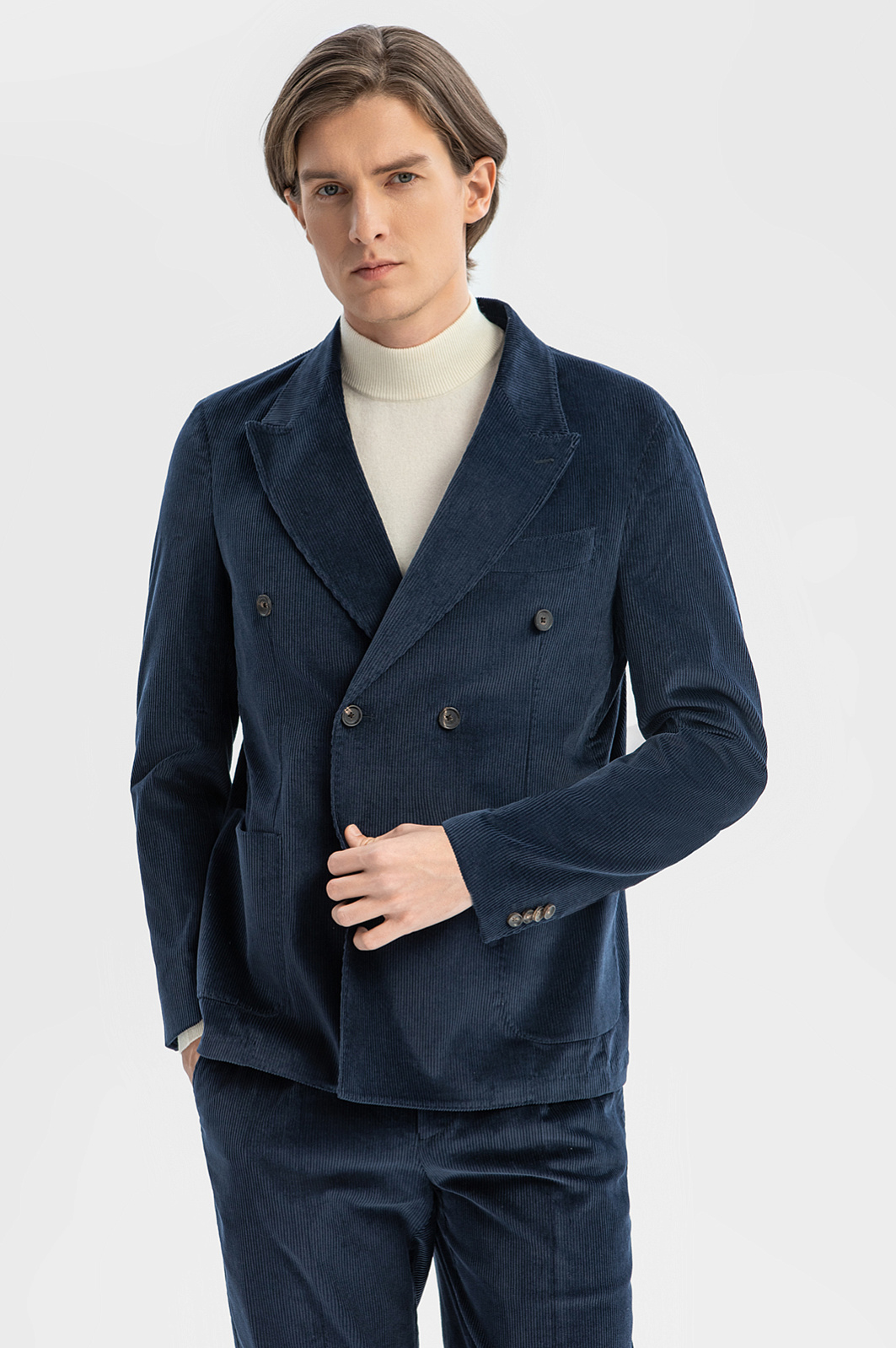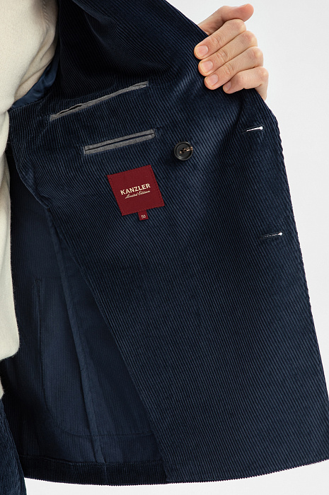 Роскошный синий вельветовый костюм KANZLER из лимитированной коллекции — это способ выглядеть и чувствовать себя хорошо на работе и отдыхе. Он выдержан в духе современной классики, которой не чужд комфорт и уют. Костюм составлен из двубортного облегченного пиджака слегка приталенного силуэта с накладными карманами, широкими лацканами и достаточно свободных прямых брюк. Вещи сшиты из эксклюзивного вельвета, произведенного признанным лидером в создании премиальных тканей из хлопка — мануфактурой Duca Visconte di Modrone (Италия). В составе ткани — гипоаллергенный воздухопроницаемый хлопок (99%). Его натуральные волокна отлично поддерживают комфортную для тела температуру. Небольшая добавка эластана (1%) помогает сохранять форму и укрепляет ткань.