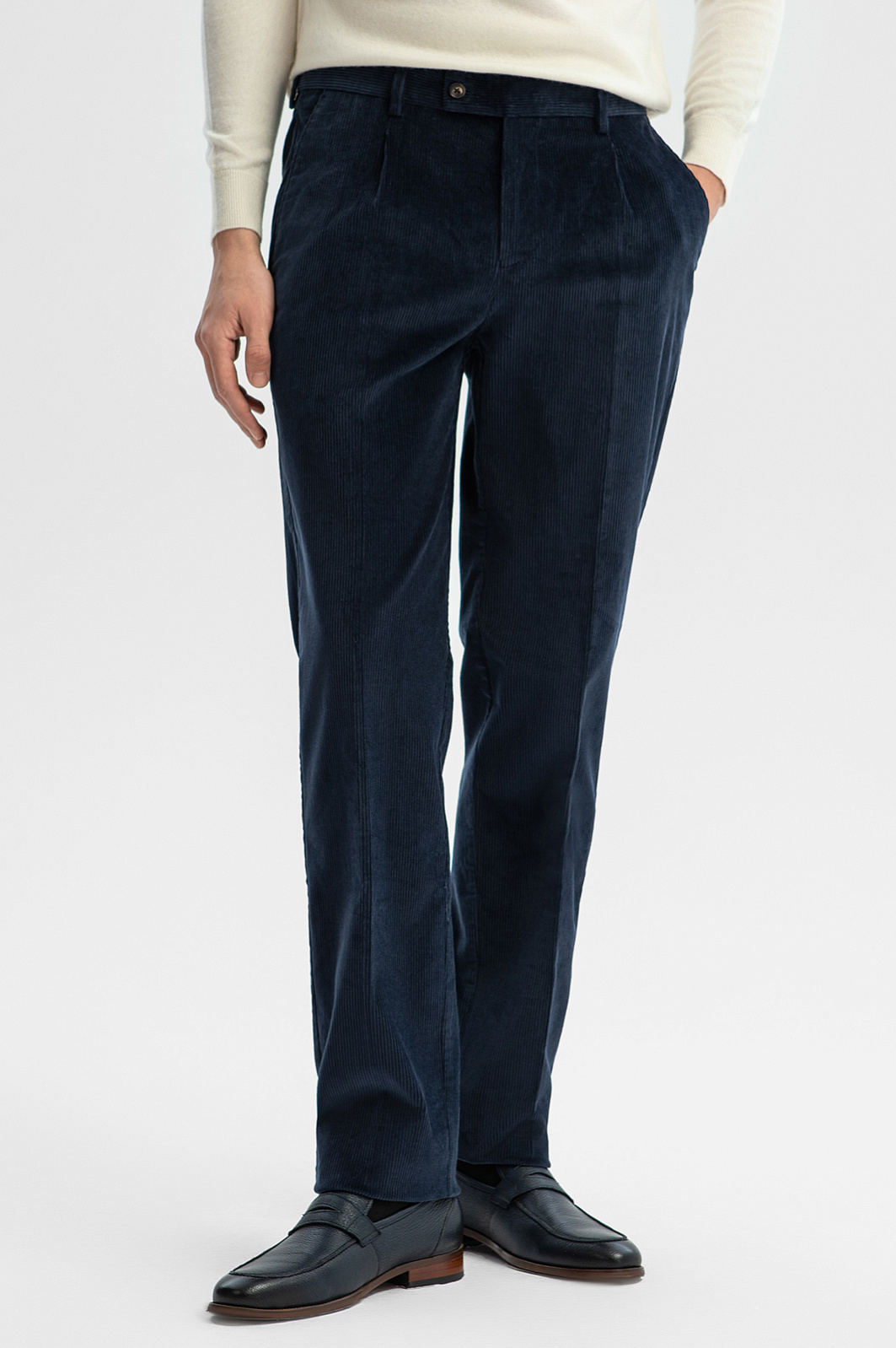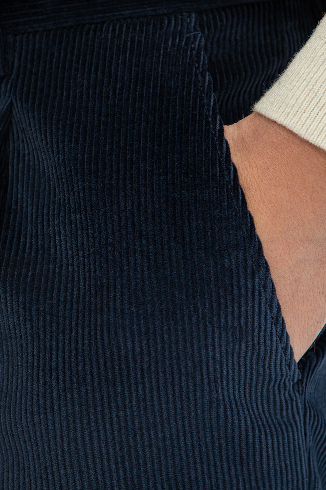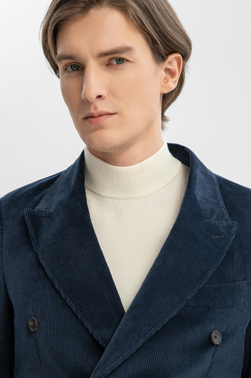 Роскошный синий вельветовый костюм KANZLER из лимитированной коллекции — это способ выглядеть и чувствовать себя хорошо на работе и отдыхе. Он выдержан в духе современной классики, которой не чужд комфорт и уют. Костюм составлен из двубортного облегченного пиджака слегка приталенного силуэта с накладными карманами, широкими лацканами и достаточно свободных прямых брюк. Вещи сшиты из эксклюзивного вельвета, произведенного признанным лидером в создании премиальных тканей из хлопка — мануфактурой Duca Visconte di Modrone (Италия). В составе ткани — гипоаллергенный воздухопроницаемый хлопок (99%). Его натуральные волокна отлично поддерживают комфортную для тела температуру. Небольшая добавка эластана (1%) помогает сохранять форму и укрепляет ткань.