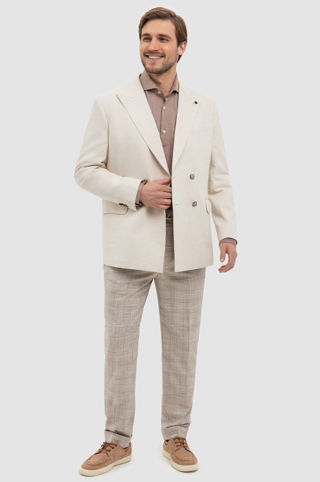 Роскошный светло-бежевый двубортный пиджак KANZLER из хлопка и льна — настоящая находка для светских выходов и неспешных променадов по городу. Широкие лацканы и заострённый воротник отдают легкой ностальгией по прошлому, с его шикарными вечеринками и элегантными мужчинами. Рукотворная строчка в тон, идущая по краю лацканов, карманов и бортов наследует традиции портновского мастерства. За комфорт отвечает в меру свободный силуэт и мягкая дорогая ткань из органических волокон. Невесомый гипоаллергенный хлопок облегчает материал и обеспечивает терморегуляцию, защищая тело от жары и прохлады. Лен приятно охлаждает кожу и придает ткани благородный вид. Параметры модели: рост 187, 100-81-97 Размер на модели: 50
