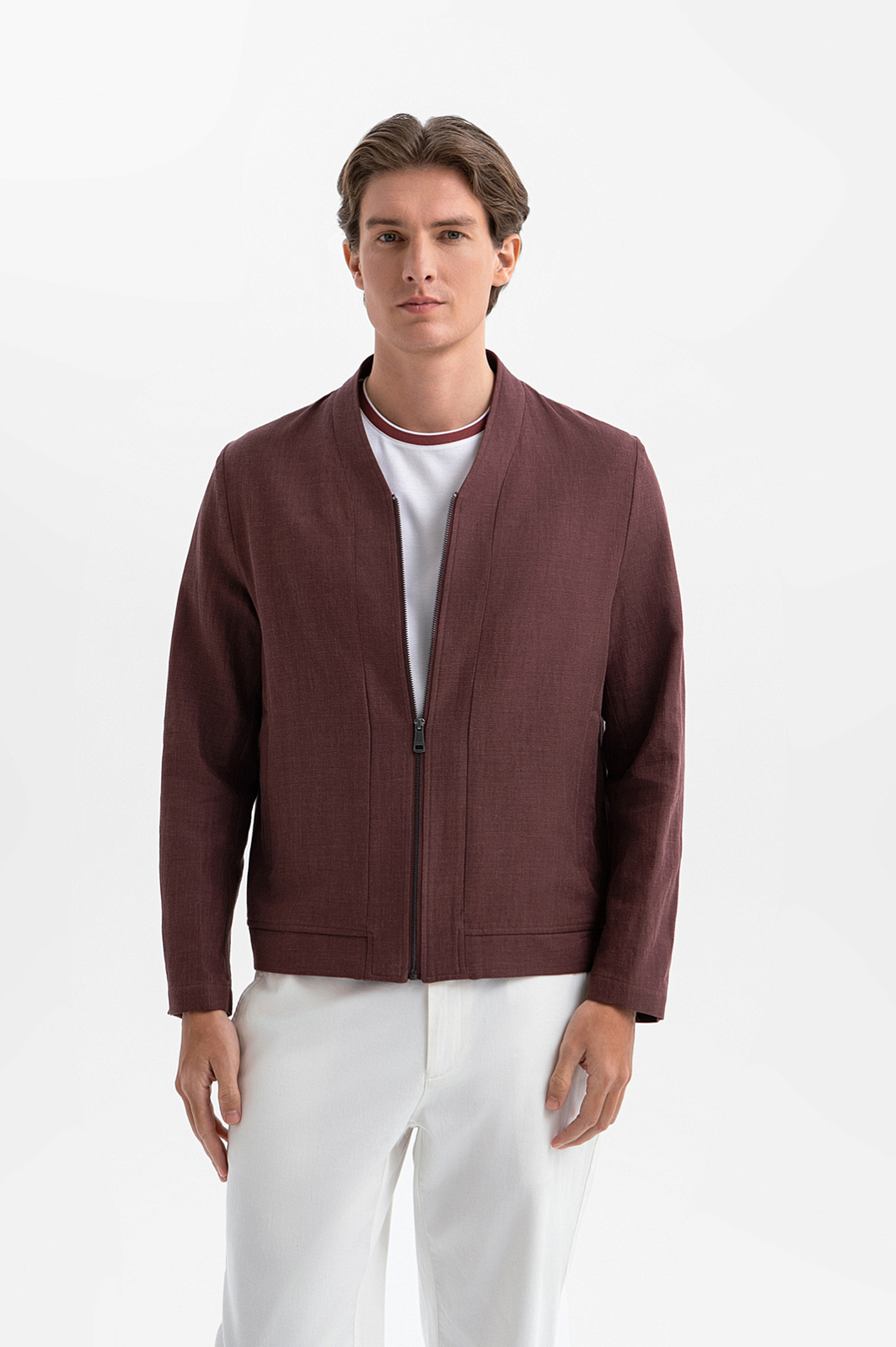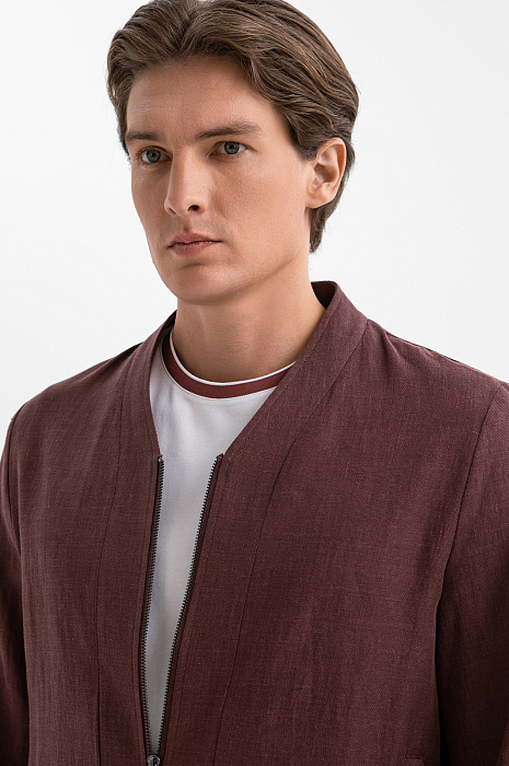 Коричневый пиджак KANZLER из хлопка и льна без воротника на молнии напоминает лёгкую куртку для тёплых дней. Идеальный выбор для прогулки в парке, неформальной встречи или свидания. Прямой свободный крой, в котором креативно сочетаются элементы куртки, пиджака и рубашки, формирует современный минималистичный силуэт. Оттенок молочного шоколада и естественная фактура материала придают образу мягкость. Смесовая ткань из натуральных волокон — гипоаллергенный воздухопроницаемый материал. Хлопок поддерживает оптимальный микроклимат. Лён укрепляет полотно и придаёт структурность.