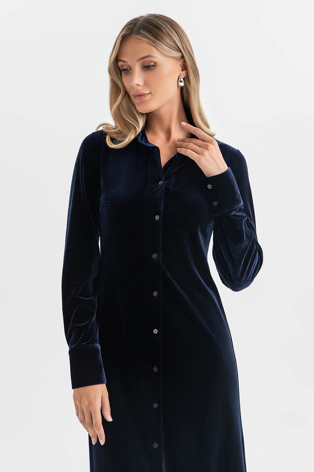 Нежная и роскошная фактура бархата в сочетании с благородным и глубоким темно-синим цветом выводят классическое платье-рубашку на новый уровень. Модель создает утонченный и одновременно комфортный образ, который отлично подойдет как для работы, так и для вечернего выхода и особых случаев. Вертикальный ряд пуговиц визуально вытягивает силуэт и позволяет регулировать степень открытости. Платье легко стилизовать под разное настроение — от романтического до делового. Наши стилисты предлагают дополнить модель классическими туфлями на каблуке, босоножками или коричневыми сумкой, ремнем и сапогами. Параметры модели: рост 180, 87-61-91 Размер на модели: S