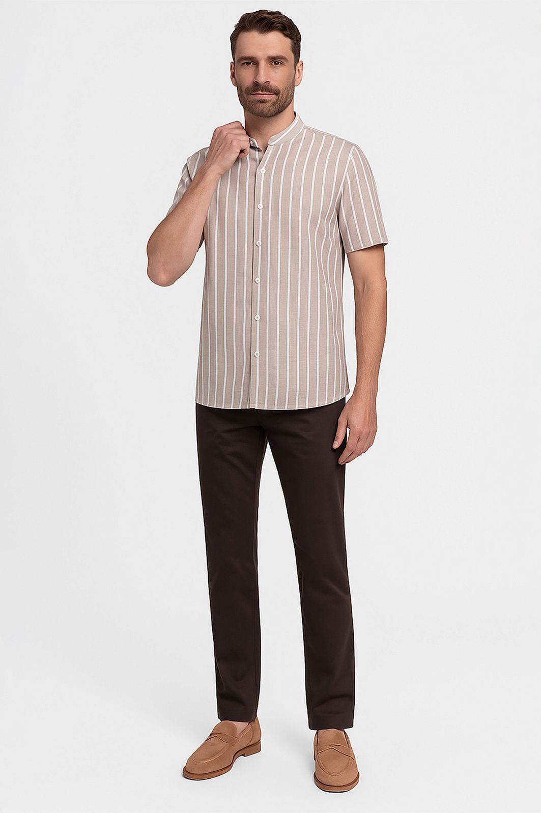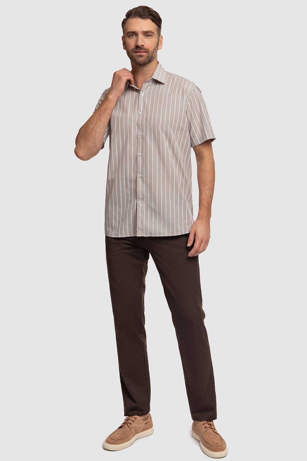 Сорочка из хлопка KANZLER с коротким рукавом настраивает на спокойный непринужденный отдых. Аристократизм и элегантность задают детали: дорогая ткань из чистого хлопка слегка шероховатой фактуры, роскошный оттенок мокко, узор в белую вертикальную полоску и аккуратный воротник-стойка. Натуральная благородная ткань из 100-процентного хлопка защищает кожу от ультрафиолетового излучения и перегрева, сохраняя оптимальную температуру даже в знойный день. Свободное прилегание обеспечивает максимальный комфорт. Спереди — застежка на пуговицы, линия низа слегка скруглена. Параметры модели: рост 189, 102-80-99 Размер на модели: 40