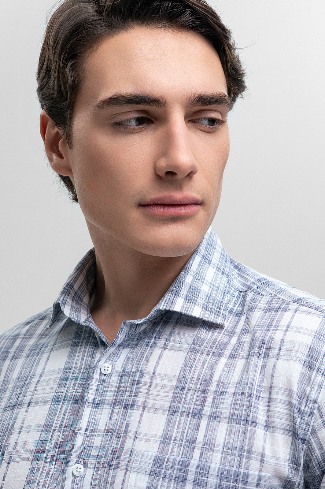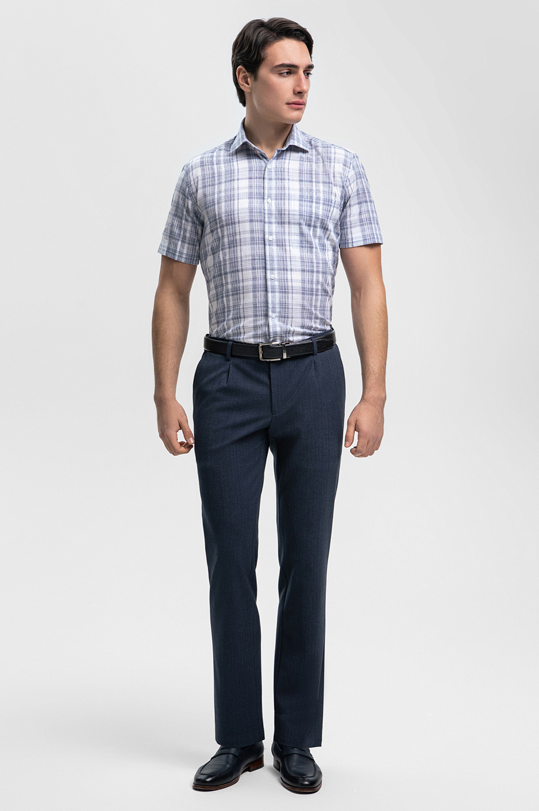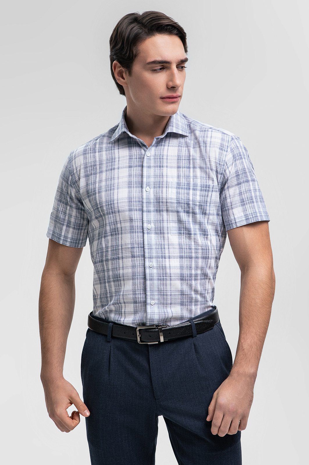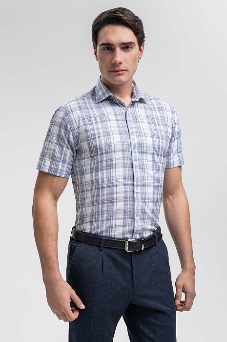 Белая сорочка KANZLER с узором в голубую клетку из австрийской премиальной ткани Getzner —воплощение элегантности и свежести. Короткий рукав и классический силуэт обеспечивают идеальную посадку и комфорт на каждый день, не ограничивая движений. Мягкий гипоаллергенный материал из 100% хлопка позволяет коже дышать, что делает эту рубашку незаменимой в теплое время года. Универсальность модели позволяет носить её как с деловыми костюмами, так и с повседневными брюками или джинсами, создавая гармоничные образы для любого случая. Параметры модели: рост 190, 103-83-99 Размер на модели: 40