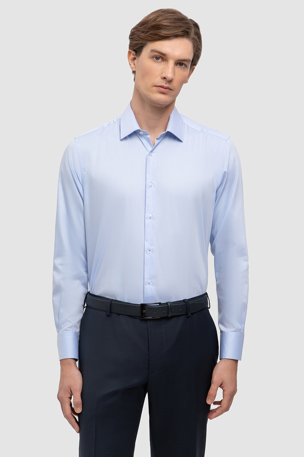 Голубую сорочку KANZLER с воротником кент сшили из тонкого гладкого хлопка. Классический силуэт обеспечивает удобную и комфортную посадку. Гладкая матовая ткань хорошо пропускает воздух, обеспечивая прекрасную воздухопроницаемость, что особенно важно в теплый период. Хлопок с гипоаллергенными свойствами обеспечивает приятные тактильные ощущения и подходит для ежедневной носки. Дополните сорочку брюками синего оттенка и лоферами в тон, чтобы добиться стильного монохромного эффекта, актуального в этом сезоне. Для создания более неформального образа можно расстегнуть верхние пуговицы. Параметры модели: рост 191, 97-77-99 Размер на модели: 40