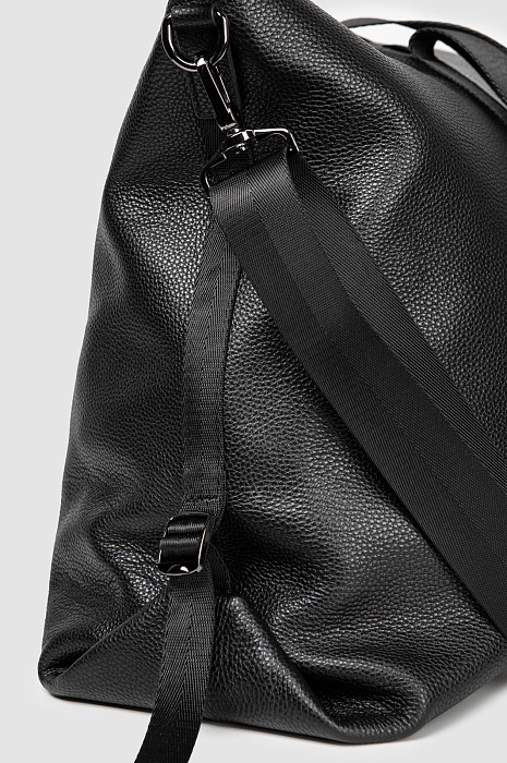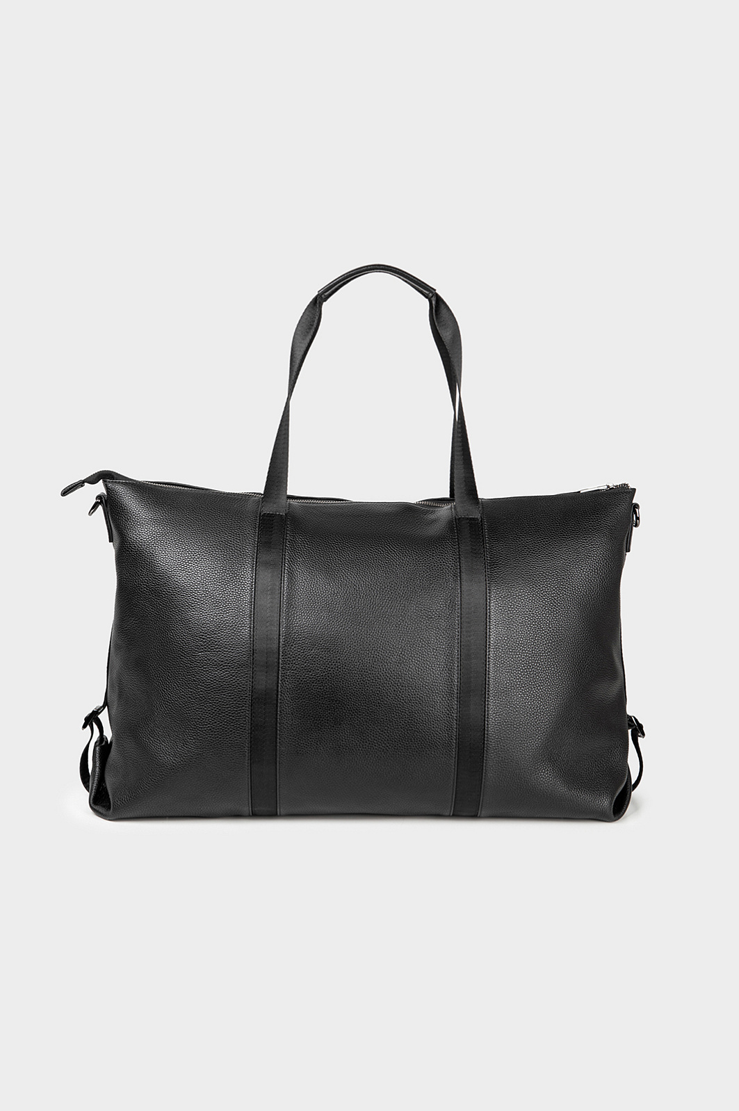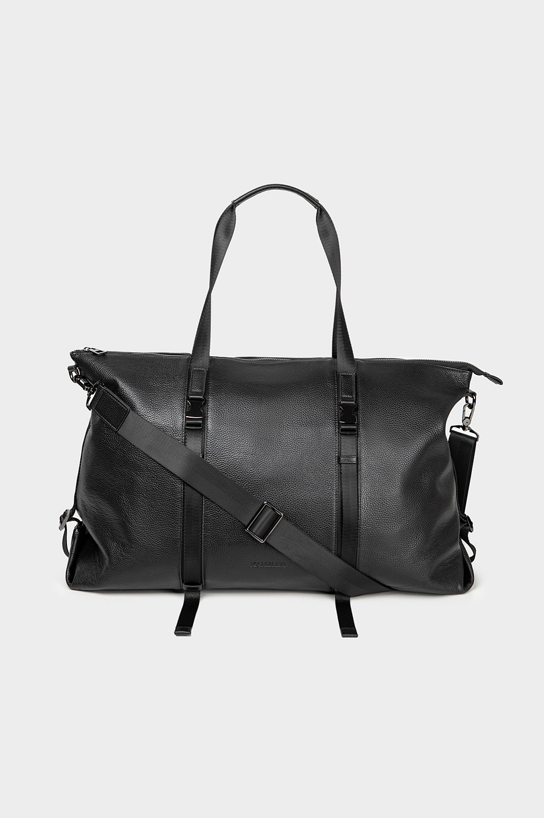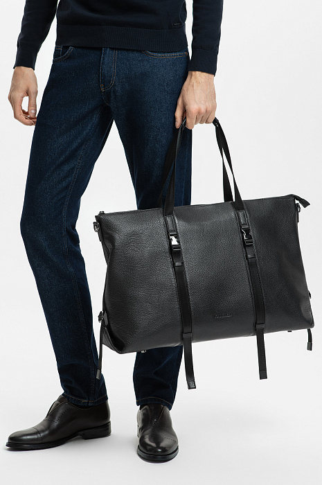 Роскошная черная дорожная сумка KANZLER из качественной зернистой кожи — идеальное сочетание современного городского стиля и функциональности. Она отлично подходит для поездок на выходные или деловых визитов: в ней удобно разместятся личные вещи, одежда, ноутбук и документы. Основная часть сделана из кожи превосходной выделки, которая придаёт аксессуару респектабельность. А текстильные ремни с металлическими пряжками добавляют лёгкости и актуальности. Длинные ручки и съемный широкий ремень позволяют носить дорожную сумку в руке или на плече.