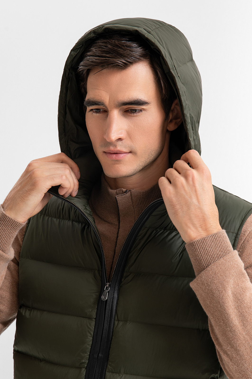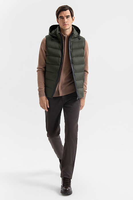 Стёганый жилет KANZLER тёмно-оливкового оттенка — практичный и универсальный элемент гардероба для прохладной погоды, который идеально подходит для создания современных многослойных образов в стиле умный кежуал. Жилет застёгивается на молнию и дополнен капюшоном, который регулируется шнурком с фиксаторами. Благодаря прямому крою и лаконичному дизайну модель легко сочетается с толстовками, джемперами или свитшотами, не стесняя движений. Универсальная модель выполнена из прочного легкого износостойкого полиамида с водоотталкивающей обработкой, защищающей от дождя и снега. Утеплитель из полиэстера обеспечивает комфорт и сохраняет тепло, не утяжеляя силуэт. Параметры модели: рост 192, 101-76-97 Размер на модели: 50