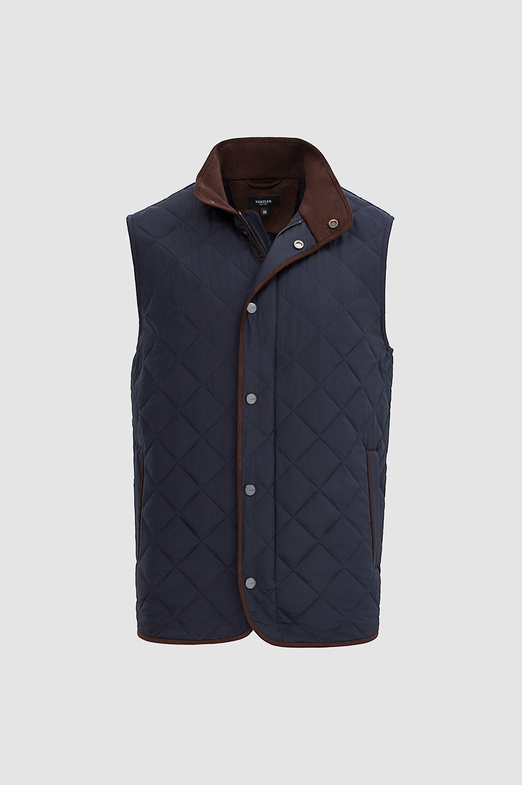 Стёганый жилет KANZLER в глубокого синего оттенке с коричневой отделкой — лёгкий способ утеплиться в прохладные дни и холодное межсезонье. Ромбовидный узор отсылает к классике английского стиля. Коричневый подборт добавляет образу теплоту и благородство. Широкая планка, прикрывающая молнию, и воротник-стойка служат надежным барьером от ветра. Водоотталкивающая обработка делает жилет неуязвимым для дождя. Внешний слой, подкладка и внутренний наполнитель сделаны из полиэстера — надежного и прочного синтетического материала, который прослужит долго, сохраняя свои защитный качества и аккуратный внешний вид.